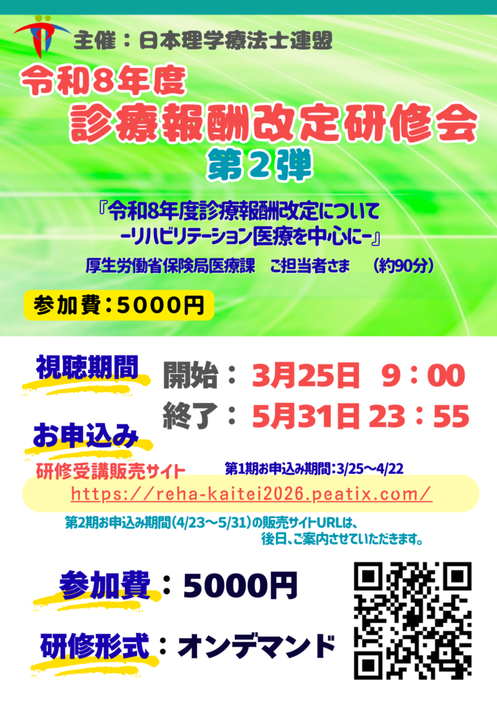 タイトル:令和8年度 診療報酬改定研修会 第2弾「令和8年度診療報酬改定について ーリハビリテーション医療を中心にー」
