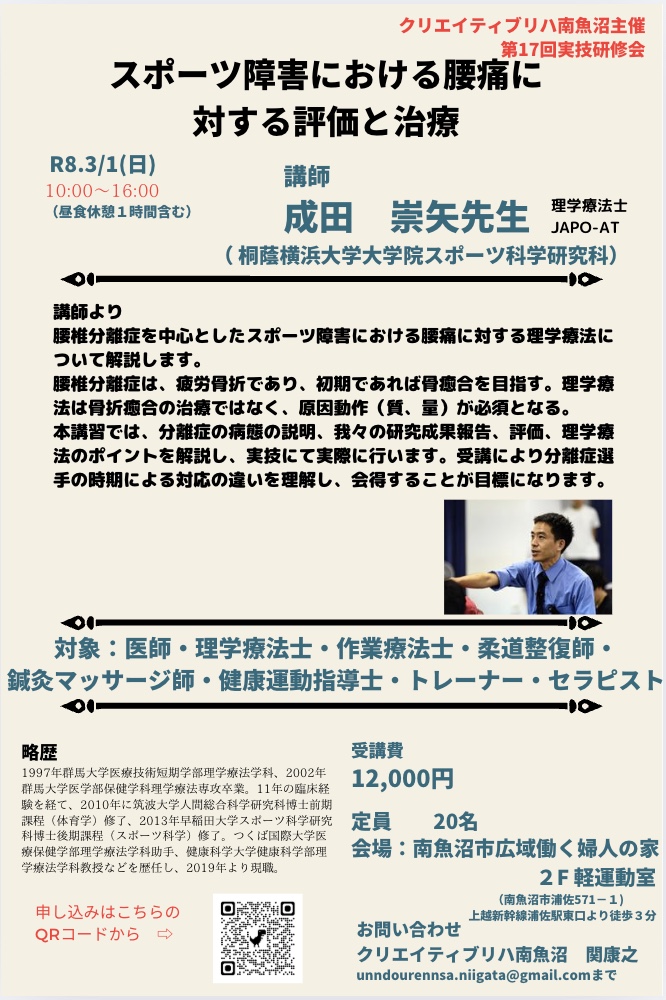 実技研修会『スポーツ障害における腰痛に対する評価と治療』のご案内